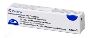 Kinder < 9 Jahre bei 1. Grippeimpfung 2. Impfung nach 4 Wochen | jährliche Neuimpfung mit dem vorliegenden Impfstoff | ab 6 Monate | i.m. oder s.c. bei Kindern 6 - 36 Monate bevorzugt in den OS, bei Kindern ab 36 Monaten und Erwachsenen in den OA | Inj. Susp. in Fsp. mit o. ohne Kanüle | 1er o.K.: 19403462 10er o.K.: 19403479 10er m.K.: 19403491 | Im Kühlschrank lagern (2 °C – 8 °C) Kühlkettenpflichtig: Ja | Sanofi-Aventis |