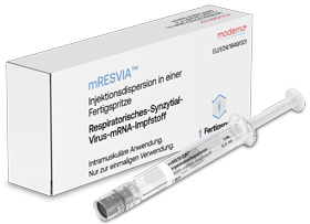 | 1 Impfung | keine Auffrischung notwendig | ab 60 Jahre | i.m. vorzugsweise in den M. deltoideus | Inj. Disp. in Fsp. | 1er: 19373637 10er: 19373643 | Im Kühlschrank lagern (2 °C – 8 °C) Kühlkettenpflichtig: Nein | Moderna |