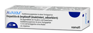| 2 Impfungen 0 - 6 - 12, spätestens 36 Monate | Persistenz von Anti-HAV-Antikörper nach zweiter Dosis bei immunkompetenten Personen vermutlich 10 Jahre, s. Fachinformation | ab 16 Jahre | i.m. | Inj. Susp.in Fsp. o. Kan. | 1er: 14370999 | Im Kühlschrank lagern (2 °C – 8 °C) Kühlkettenpflichtig: Ja | Sanofi-Aventis |