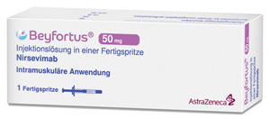 | Einmaldosis, abhängig vom Gewicht des Säuglings (s. Fachinfo) Verabreichung während oder vor der ersten RSV-Saison | keine Auffrischung notwendig | Säuglinge ab der Geburt | i.m. vorzugsweise in den anterolateralen Oberschenkel | Inj. Lsg. in Fsp. o. Kan. | 50mg: 18425763 100mg: 18425786 | Im Kühlschrank lagern (2 °C – 8 °C) Kühlkettenpflichtig: Ja | Sanofi-Aventis |