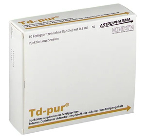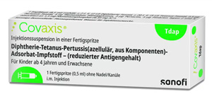 kann zum passiven Schutz gegen Pertussis im frühen Säuglingsalter nach mütterlicher Immunisierung während des zweiten oder dritten Trimenons schwangeren Frauen verabreicht werden | 1 Impfung alle 10 Jahre laut STIKO-Empfehlung | ab 4 Jahre | i.m. | Inj. Susp. in Fsp. mit Kan. 1er o. Kan. 10er | 1er: 12590099 10er: 12590107 | Im Kühlschrank lagern (2 °C – 8 °C) Kühlkettenpflichtig: Ja | Sanofi-Aventis |