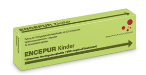 | FSME | Encepur Kinder | 3 Impfungen Konventionelles Schema 0 - 14 Tage bis 3 Monate - 9 bis 12 Monate nach 2. Dosis Schnellimmunisierung 0 – 7 – 21 Tage | Konventionelles Schema 1. Auffrischung nach 3 Jahren, danach alle 5 Jahre Schnellimmunisierung 1. Auffrischung nach 12 bis 18 Monaten, danach alle 5 Jahre | ab 1 Jahr bis 11 Jahre | i.m. in den Oberarm | Inj. Susp. in Fsp. o. Kan. | 1er: 16632647 10er: 16632676 20er: 16632682 | Im Kühlschrank lagern (2 °C – 8 °C) Kühlkettenpflichtig: Nein | Bavarian Nordic  |