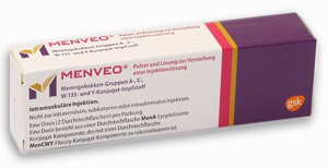 | 1 Impfung | Persistenz von Antikörpern bis 5 Jahre,s. Fachinformation Auffrischung mit Menveo möglich bei Personen, die grundimmunisiert sind mit Menveo, mit anderen Meningokokken-Konjugatimpfstoffen oder unkonjugierten Polysaccharid-Impfstoffen | ab 2 Jahre für die Altersgruppe von 56 bis 65 liegen nur begrenzt bzw. für Personen > 65 Jahren keine Daten vor | i.m. in den Oberschenkel | Trs. in Dfl. mit Lsg. in Dfl. | 1er: 09223492 | Im Kühlschrank lagern (2 °C – 8 °C) Kühlkettenpflichtig: Nein | GSK Vaccines GmbH |