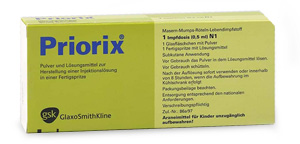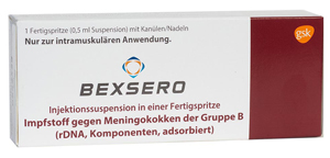 | 3 Impfungen + Booster (3+1) Grundimmunisierung: Mindestabstand von je 4 Wochen 2 Impfungen + Booster (2+1) Grundimmunisierung: Mindestabstand von 4 Wochen | 1 Impfung vorzugsweise zwischen vollendeten 11. -13. Lebensmonat Mindestabstand zur letzten Impfung: 6 Monate | ab 2 Monate | tief i.m. in den Oberschenkel | Plv. + Susp. in Fsp. o. Kan. | 1er: 08627715 10er: 08627721 | Im Kühlschrank lagern (2 °C – 8 °C) Kühlkettenpflichtig: Nein | GSK Vaccines GmbH |