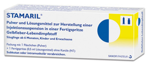 | Gelbfieber | Stamaril (Lebendimpfstoff) | eine Dosis von 0,5 ml mindestens 10 Tage vor Einreise in Endemiegebiet | Auffrischung je nach Expositionsrisiko, Immunantwort und Impfempfehlungen einzelner Länder nach 10 J. | ab 9 Monate (unter bes. Umständen ab 6 Monate s. Fachinfo.) bis 60 Jahre | vorzugsweise s.c. | Plv. + Lsg. in Fsp. o. Kan. | 1er: 02528981 10er: 02528998 | Im Kühlschrank lagern (2 °C – 8 °C) Kühlkettenpflichtig: Ja | Sanofi-Aventis |