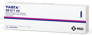 | 2 Impfungen 0 – 6 bis 18 Monate | Persistenz von Anti-HAV-Antikörper nachzweiter Dosis bei immunkompetentenPersonen bis 41 Jahren vermutlich 25 Jahre, s. FI | ab 18 Jahre | i.m. | Inj. Susp.in Fsp. o. Kan. | 1er: 04397750 10er: 04397767 | Im Kühlschrank lagern (2 °C – 8 °C) Kühlkettenpflichtig: Ja | MSD Sharp & Dome |