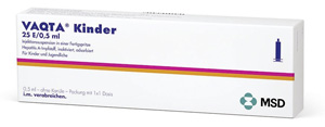 | 2 Impfungen 0 – 6 bis 18 Monate | Persistenz von Anti-HAV-Antikörper nachzweiter Dosis bei immunkompetenten Personen vermutlich 25 Jahre, s. Fachinformation | ab 1 Jahr bis zum 18. Geburtstag | i.m. in den OA, bei Säuglingen und Kleinkindern vorzugsweise in den OS | Inj. Susp.in Fsp. o. Kan. | 1er: 04397773 | Im Kühlschrank lagern (2 °C – 8 °C) Kühlkettenpflichtig: Ja | MSD Sharp & Dome |