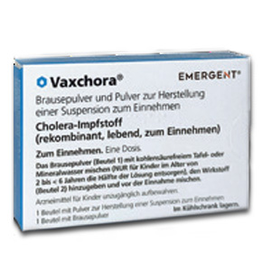 | Eine Einzeldosis zum Einnehmen sollte spätestens 10 Tage vor einer potenziellen Exposition mit V. cholerae O1 verabreicht werden | Es liegen keine Daten für das Intervall der Auffrischungsimpfung vor | Erwachsene + Kinder ab 2 Jahre | oral: Rekonstituierte Susp. auf einmal schlucken | Susp. zum Einnehmen aus Brauseplv. und Plv. | 1er: 18304249 | Im Kühlschrank lagern (2 °C – 8 °C) Kühlkettenpflichtig: Nein | Pharmore |