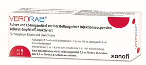 Weitere Postexpositionelle Prophylaxe Impfschemen möglich (siehe Fachinformation) | 1 Impfung auf Grundlage des Expositionsrisikos sowie serologischer Tests | in jedem Alter | i.m. in den Oberarm, bei kleinen Kindern und Säuglingen in den Oberschenkel oder i.d. bei postexpositioneller Prophylaxe mit 0,1 ml/Dosis in den Oberarm oder Unterarm | Plv. + Lsg. | 1er: 06864859 | Im Kühlschrank lagern (2 °C – 8 °C) Kühlkettenpflichtig: Ja | Sanofi-Aventis |