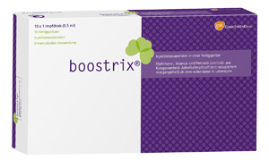 kann zum passiven Schutz gegen Pertussis im frühen Säuglingsalter nach mütterlicher Immunisierung während des zweiten oder dritten Trimenons schwangeren Frauen verabreicht werden | 1 Impfung alle 10 Jahre laut STIKO-Empfehlung | ab 3 Jahre | tief i.m. | Inj. Susp. in Fsp. o. Kan. | 1er: 00762081 10er: 00762098 | Im Kühlschrank lagern (2 °C – 8 °C) Kühlkettenpflichtig: Nein | GSK Vaccines GmbH |