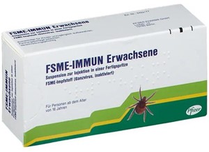| FSME | FSME-IMMUN Erwachsene | 3 Impfungen Konventionelles Schema 0 - 1 bis 3 Monate - 5 bis 12 Monate nach 2. Dosis Schnellimmunisierung 0 - 14 Tage - 5 bis 12 Monate nach 2. Dosis | 1. Auffrischung nach 3 Jahren danach alle 5 Jahre (Alter < 60 Jahre) alle 3 Jahre (Alter ≥ 60 Jahre) | ab 16 Jahre | i.m. in den Oberarm | Inj. Susp. in Fsp. o. Kan. | 1er: 10259495 10er: 10259503 | Im Kühlschrank lagern (2 °C – 8 °C) Kühlkettenpflichtig: Nein | Pfizer Pharma |