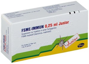 | FSME | FSME-IMMUN Junior | 3 Impfungen Konventionelles Schema 0 - 1 bis 3 Mon. - 5 bis 12 Mon. nach 2. Dosis Schnellimmunisierung 0 - 14 Tage - 5 bis 12 Monate nach 2. Dosis | 1. Auffrischung nach 3 Jahren danach alle 5 Jahre | ab 1 Jahr bis 15 Jahre | i.m. Säuglinge und Kleinkinder ≤ 18 Monate bevorzugt i. d. Oberschenkel | Inj. Susp. in Fsp. o. Kan. | 1er: 03100529 10er: 10259526 | Im Kühlschrank lagern (2 °C – 8 °C) Kühlkettenpflichtig: Nein | Pfizer Pharma |