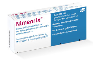Auffrischung ab einem Alter von 12 Monaten mit Nimenrix möglich bei Personen, die grundimmunisiert sind mit Nimenrix, einem Konjugat- oder einfachen Polysaccharid-Meningokokken-Impfstoff. | ab 6 Wochen | i.m. in den Oberarm oder Oberschenkel (bei Säuglingen bevorzugt in den Oberschenkel) | Trs. m. Lsg. in Fsp. o. Kan. | 1er: 09385214 10er: 09385220 | Im Kühlschrank lagern (2 °C – 8 °C) Kühlkettenpflichtig: Nein | Pfizer Pharma |