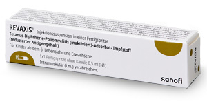 | Nur zur Auffrischung – nicht zur Grundimmunisierung zugelassen | 1 Impfung alle 10 Jahre laut STIKO-Empfehlung | ab 6 Jahre | i.m. | Inj. Susp. in Fsp. o. Kan. | 1er: 08645759 10er: 08645765 | Im Kühlschrank lagern (2 °C – 8 °C) Kühlkettenpflichtig: Ja | Sanofi-Aventis |