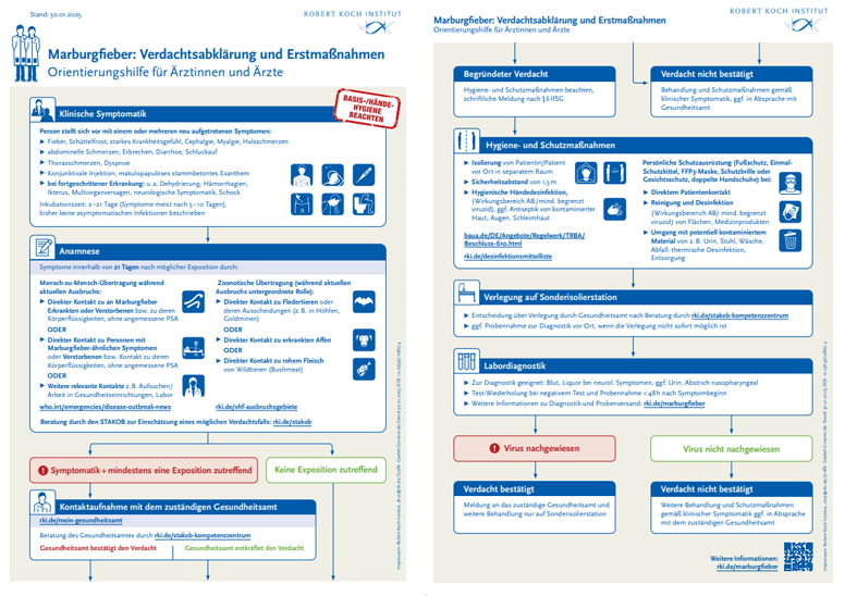 Das frühzeitige Erkennen von Infektionskrankheiten und das Ergreifen der erfoderlichen Maßnahmen spielt eine entscheidende Rolle im Infektionsschutz. Um die Ärzteschaft bei ihrer täglichen Arbeit zu unterstützen, stellt das RKI Orientierungshilfen zu verschiedenen Infektionskrankheiten bereit. Die Orientierungshilfen für Ärztinnen und Ärzte geben Hinweise zur Symptomatik und Anamnese, Hygiene, Diagnostik und ggf. Meldung sowie zur weiteren Vorgehensweise zu den jeweiligen Infektionskrankheiten. Weitere Informationen zu Infektionskrankheiten finden Sie unter www.rki.de>Themen>Infektionskrankheiten A-Z